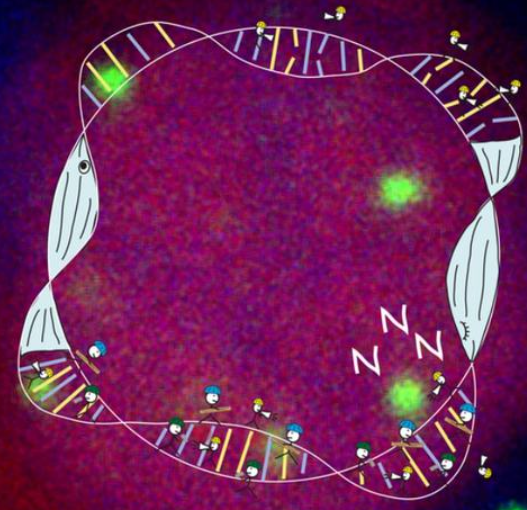 在清醒的时候,神经元中的DNA损伤积累会增加疲劳感,促进睡眠;Parp1蛋白(黄色头盔)感知并标记细胞中的DNA损伤,驱动睡眠,招募修复系统(绿色和蓝色头盔);睡眠期间,DNA修复系统修复DNA损伤,重新开始新的一天。